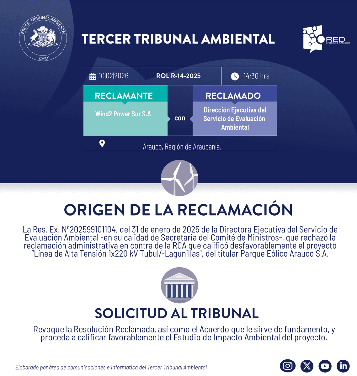 El Tercer Tribunal Ambiental pone a su disposición la transmisión de la audiencia de alegatos, de la causa R-14-2025 “Wind2 Power Sur S.A con Dirección Ejecutiva del Servicio de Evaluación Ambiental”, que se realiza el martes 10 de febrero, a las 14.30 hrs.