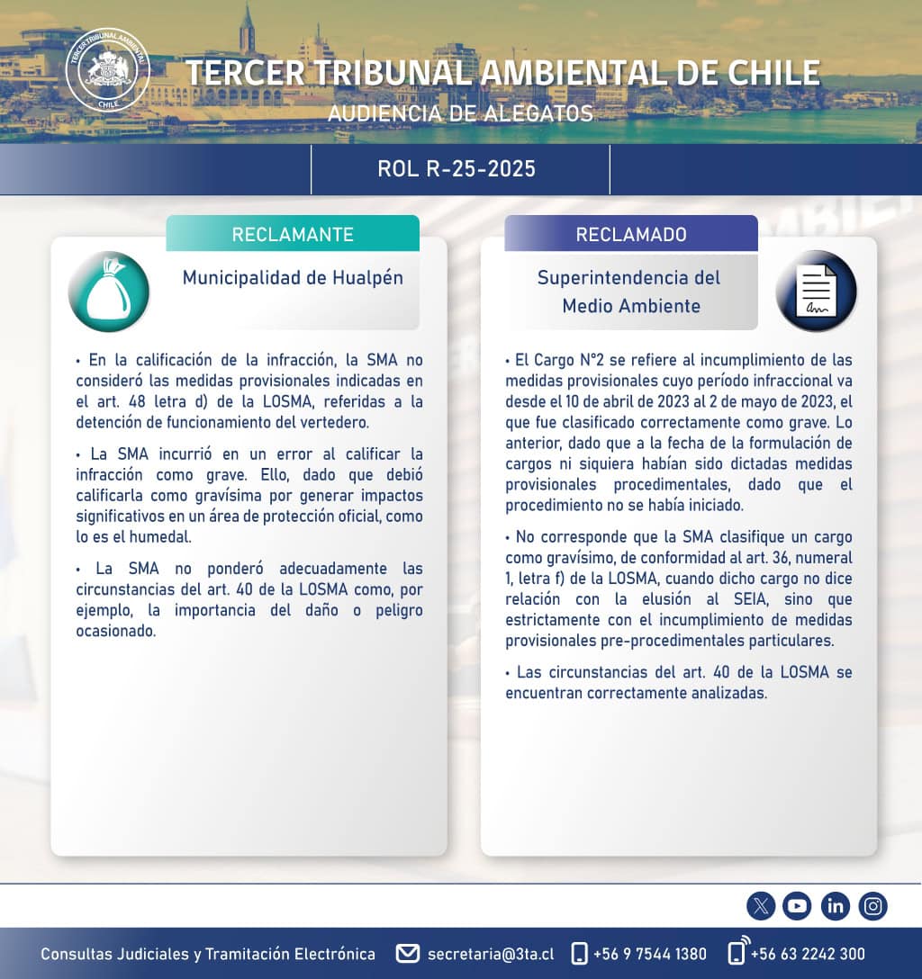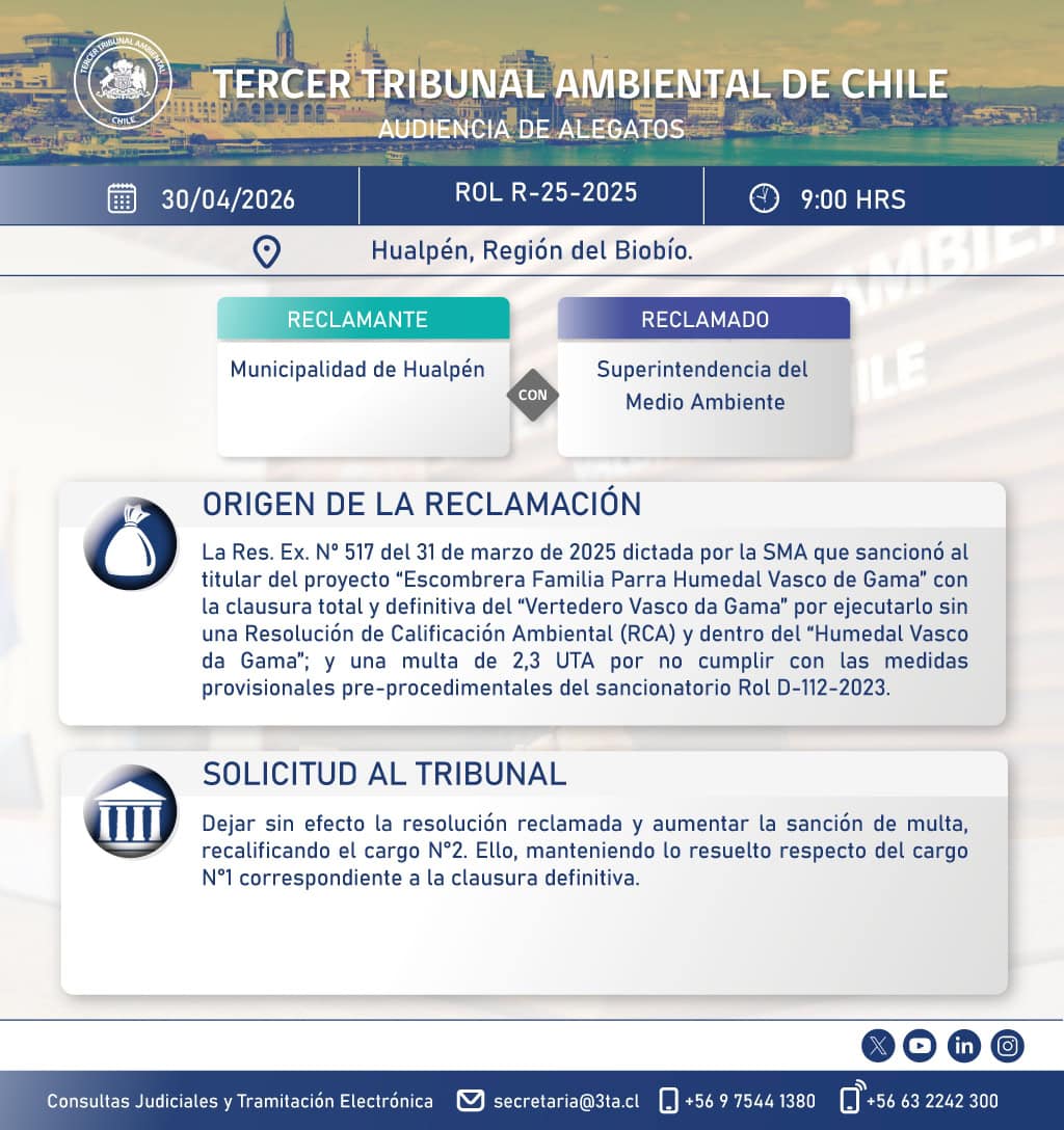 El Tercer Tribunal Ambiental pone a su disposición la transmisión de la audiencia de alegatos, modalidad híbrida, de la causa R-25-2025 “Municipalidad de Hualpén con Superintendencia del Medio Ambiente», que se realiza el jueves 30 de abril, a las 9:00 hrs.