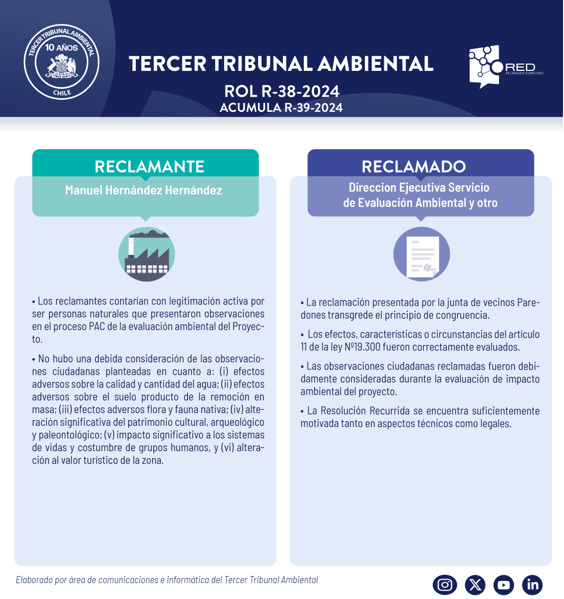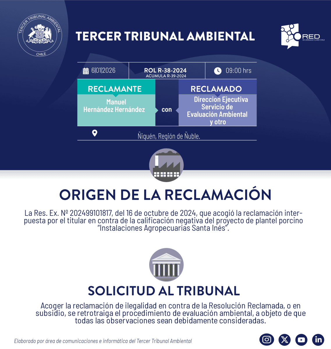 El Tercer Tribunal Ambiental pone a su disposición la transmisión de la audiencia de alegatos, modalidad híbrida, de la causa R-38-2024 (acumula R-39-2024) “Manuel Hernández Hernández y otros con Dirección Ejecutiva Servicio de Evaluación Ambiental y otro” , el martes 6 de enero, a las 9.00 hrs.