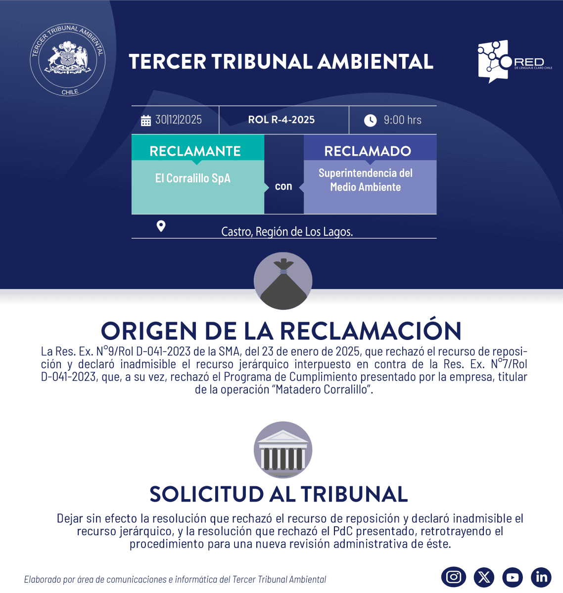 El Tercer Tribunal Ambiental pone a su disposición la transmisión de la audiencia de alegatos, modalidad híbrida, de la causa R-4-2025 «El Corralillo SpA con Superintendencia del Medio Ambiente«, el martes 30 de diciembre, a las 9.00 hrs.